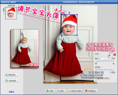 第四步:调节头像的大小,使之可以很好地结合口袋图片中的宝宝身体。为了使效果逼真,所以要取消阴影和描边。如图6所示。