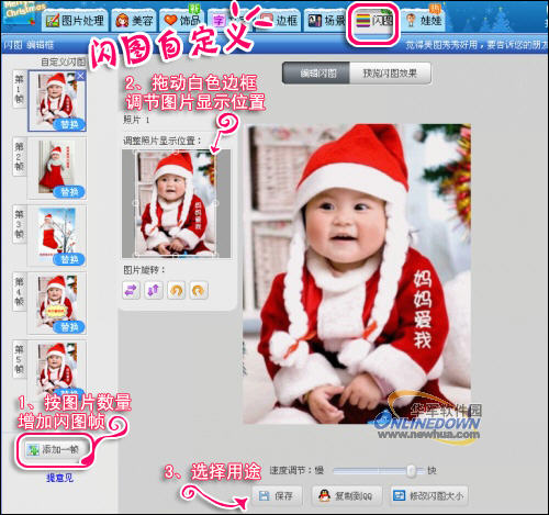 制作也非常简单,只要将之前做好的图片,加上一些特别的文字,然后利用“闪图—自定义闪图”,将几张图片用闪图帧的形式制作成闪图!如图10所示。