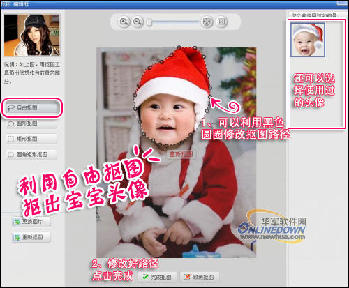 第二步:进入抠图界面后,用鼠标抠图宝宝头像,可以在抠好的路径上,通过增减黑色圆圈来修改路径,以达到 完美的抠图效果。如图4所示。
