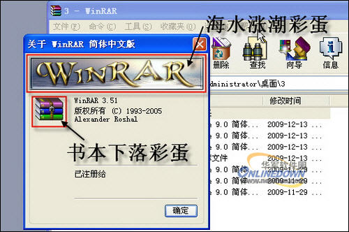 挖蛋方法:彩蛋在软件版本说明窗口中(海水涨潮)。通过“帮助-关于WinRAR”菜单进入,当鼠标移动到“关于WinRAR”窗口顶端的海景图片时,你就会发现原本静止的海水开始涨潮了,再点击鼠标海水将回复到静止状态;另外,单击左上角的书本图标,那一摞书本会开始下落了,落到底后还会反弹,仔细听听还有声音哦。践作如图3所示,效果展示如图4所示。