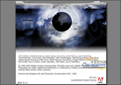 挖蛋方法:在Photoshop的每个版本的“关于Photoshop”对话框中,都会显示不同的彩蛋画面。比如在Photoshop8.0版本中,按住Ctrl和Alt键的同时点击帮助菜单中的“关于Photoshop…”,弹出的对话框中会显示一个怪阴深的图片,如图7所示。而Photoshop CS2 (9.0)则显示的是一只可爱的猴子,如图8所示。