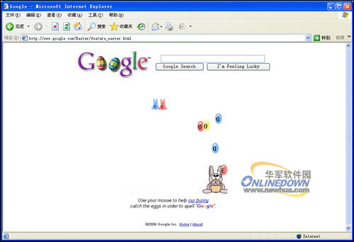 挖蛋方法:在IE浏览器中输入http://www.Google.com/easter/feature_easter.html,回车后即会进入一个游戏界面,点击中间的小兔子即开始游戏。移动鼠标控制小兔子,按页面下方彩色字母提示分别接住落下的各个字母就算过关,如图9所示。