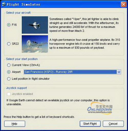 挖蛋方法:打开Google Earth4.2版本,软件完全加载完毕后在“地球”上按住鼠标左键,同时按下Ctrl + Alt + A组合键,游戏彩蛋窗口就出现了,如图12所示。选择飞机和跑道后点击“Start Flight”就可以开始玩了,如图13所示。