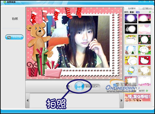 现在打开摄像头并挑选喜欢的边框吧,美图拍拍自带了非常多的大头贴边框供选择,不过还是希望以后能再多些啦(如果可以自己导入喜欢的边框就更好咯!)。选好边框后选择“拍照”键拍摄即可,如下图: