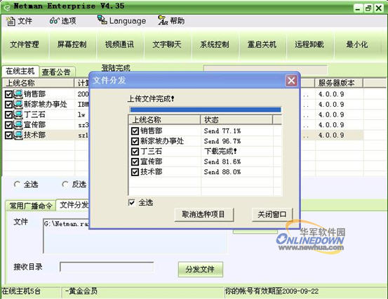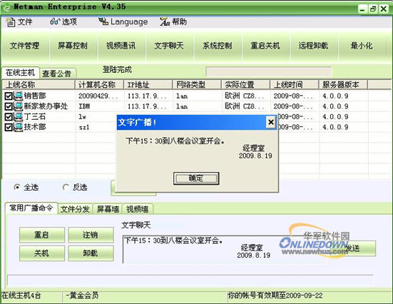 企业版一对多的控制更方便企业管理分支机构、管理者管理职员办公电脑、管理公司不同城市各部门远程电脑等远程管理使用。另外,企业版还有视频墙、批量关机、远程重启、远程注销、系统进程管理、视频语音聊天、文字信息交流等办公功能,在此不一一介绍,大家可自己下载试用软件。