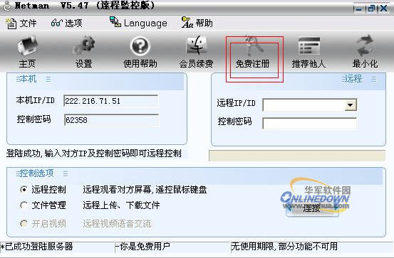 呼出软件后,点击上面的“免费注册”,注册至尊会员,可使用软件的全部功能,实现远程桌面监控,对方看不到任何提示。远程监控版默认不控制对方鼠标、键盘,只看查看对方桌面,可进行屏幕拍照、录相。默认设置不控制对方鼠标、键盘,可强制开启对方电脑上的摄像头。