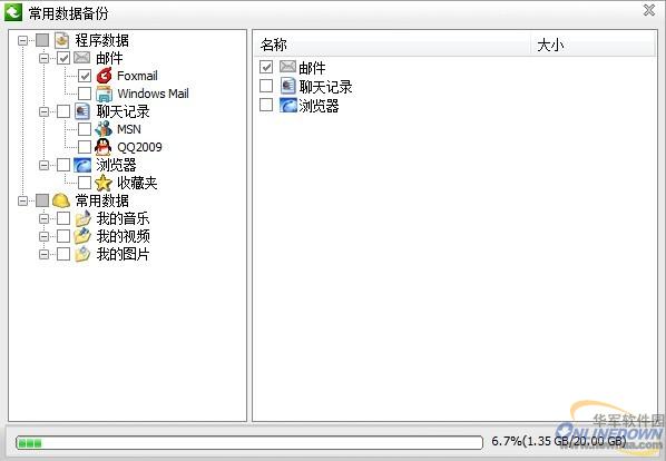 软件界面非常简洁大方(图2),几大功能按钮一目了然,用“备份常用数据”对重要邮件进行了备份,践作很简单,点击“备份常用数据”,会显示邮件、聊天记录、收藏夹、文档等重要数据,勾选邮件(图3),点击“立即备份”,程序就开始备份所选数据了。