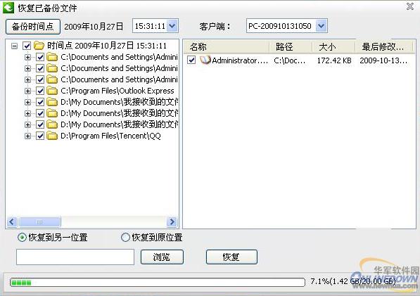 在数据恢复方面,程序提供了“一键恢复”功能,软件可以根据时间选择来挑选需要恢复的文件,通过“恢复到另一位置”和“恢复到原位置”两种方式来恢复备份,避免了可能出现的恢复错误(图5)。恢复文件的速度与备份存储速度一样,如果使用的是1M的独立带宽,100M的文件大概需要7至8分钟。