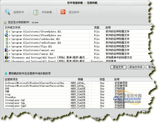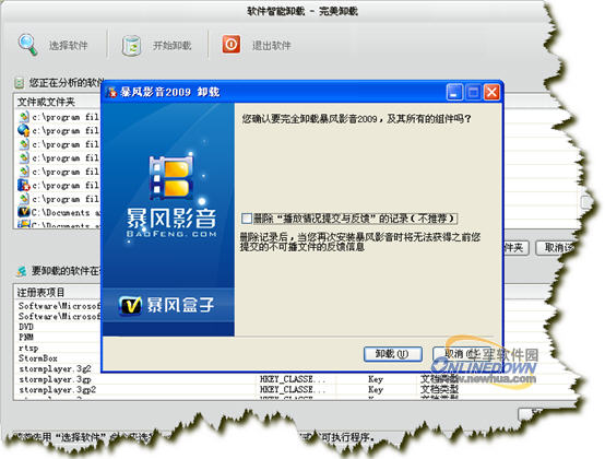 完美卸载会替你分析出暴风影音安装的所有数据,包括文件,快捷方式,注册表项,开机启动项等,在分析完成后,如果你真的想卸载这个软件,直接点”开始卸载”即可,