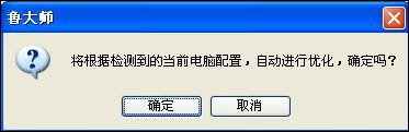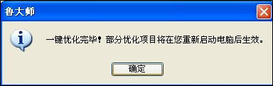 点击右下角的“一键优化”绿色文字链,出现一对话框,如图五所示,点击确定,鲁大师便能方便快捷地对未优化的项目,逐个优化。 后当出现如图六所示对话框时,点击确认,整个电脑优化结束。