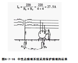 在电源的中性点接地的配电系统中,只能采用保护接零,如果采用保护接地则不能有效 地防止人身触电事故。如图6-7-16所示,若采用保护接地,电源中性点接地电阻与电气设 备的接地电阻均按4Ω考虑,而电源电压为220V,那么当电气设备的绝缘损坏使电气设备外壳带电时,则两接地电阻间的电流将为: