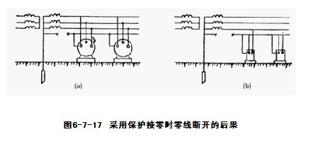 1.在保护接零系统中,零线起着十分重要的作用。一旦出现零线断线,接在断线处后面一段线路上的电气设备,相当于没作保护接零或保护接地。如果在零线断线处后面有的电 气设备外壳漏电,则不能构成短路回路,使熔断器熔断,不但这台设备外壳长期带电,而且使接在断线处后面的所有作保护接零设备的外壳都存在接近于电源相电压的对地电压,触电 的危险性将被扩大,如图6-7-17(a)所示。